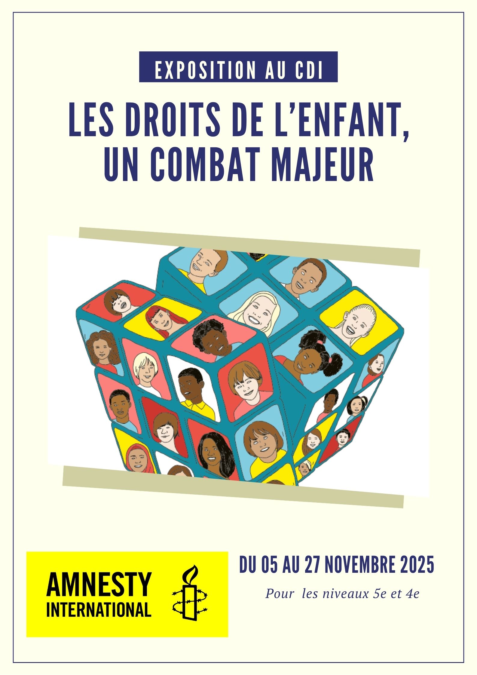 L’exposition « Les droits de l’enfant, un combat majeur » est une exposition en quinze affiches, proposée par l'ONG Amnesty International France. Elle présente l’histoire des droits de l'enfant dans le monde et les garanties associées à la CIDE (Convention internationale des droits de l’enfant), texte international qui défend ces droits depuis 1989. Elle met également l’accent sur neuf thématiques concernant l'enfance (l'exil, la citoyenneté, le travail, la guerre, la justice des mineurs, les soins, l'identité, l'égalité des droits, l'école), en précisant les constats et les enjeux. L’objectif de cette exposition est de faire connaître les principaux articles de ce texte et de susciter une large mobilisation en faveur des droits de l’enfant à travers le monde.