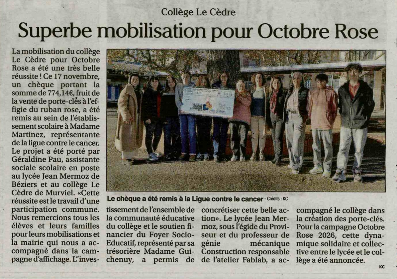 Ce lundi matin, le collège Le Cèdre de Murviel-lès-Béziers a célébré une belle victoire collective en procédant à la remise officielle d’un chèque à la Ligue contre le cancer.